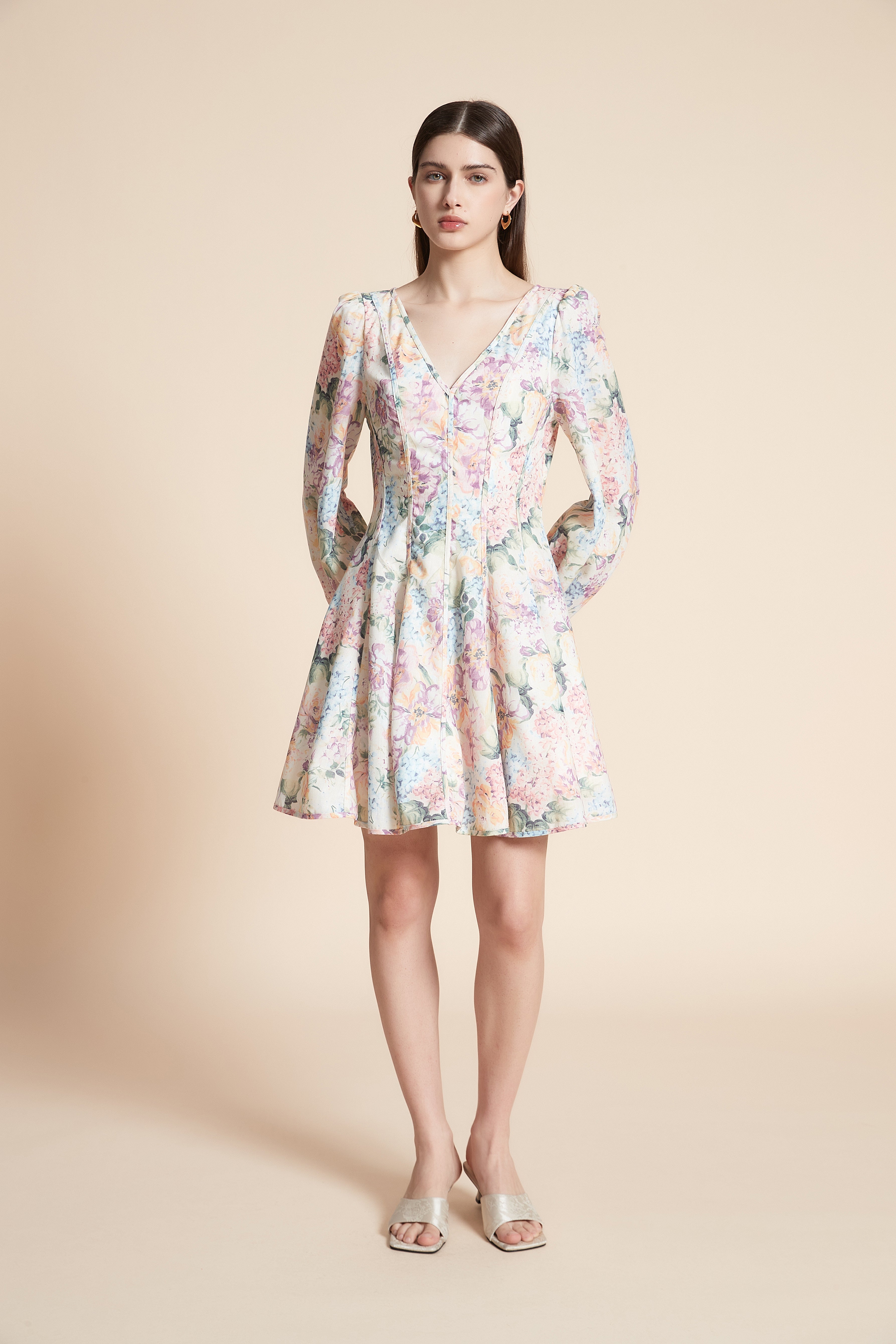 فستان قصير منقوش كم طويل