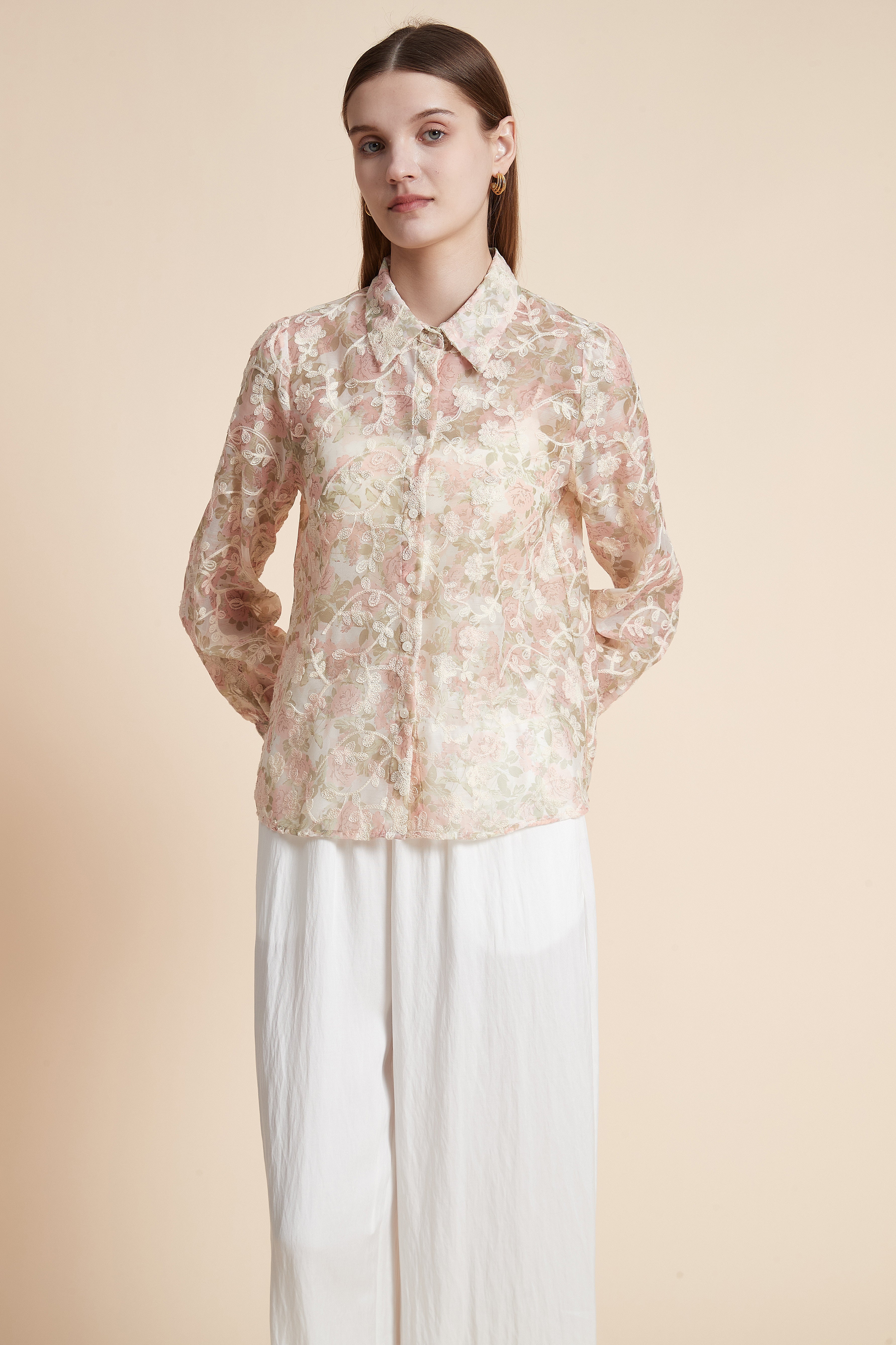 قميص مطرز بأكمام طويلة شفاف