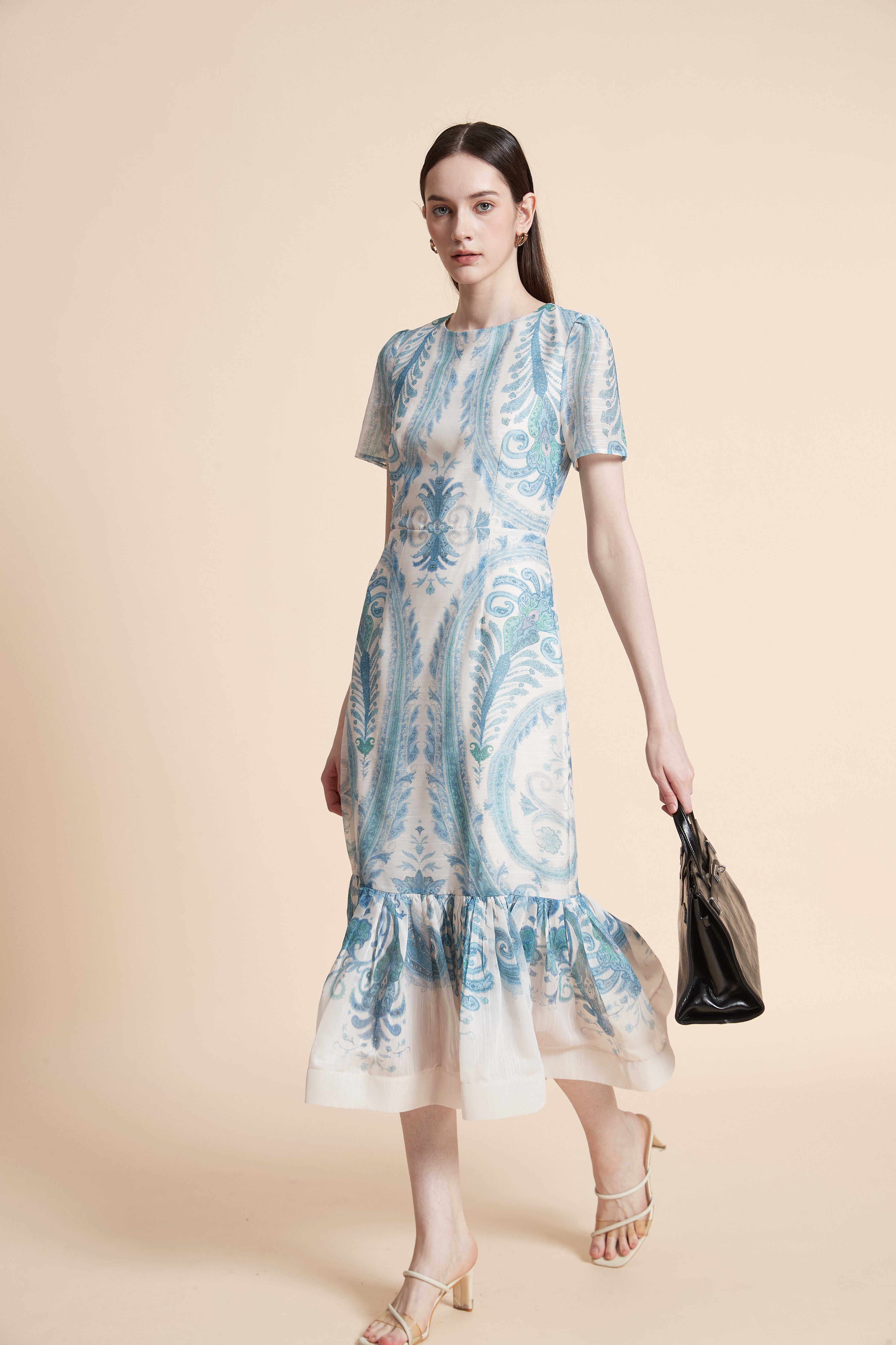 فستان ميدي منقوش بأكمام قصيرة