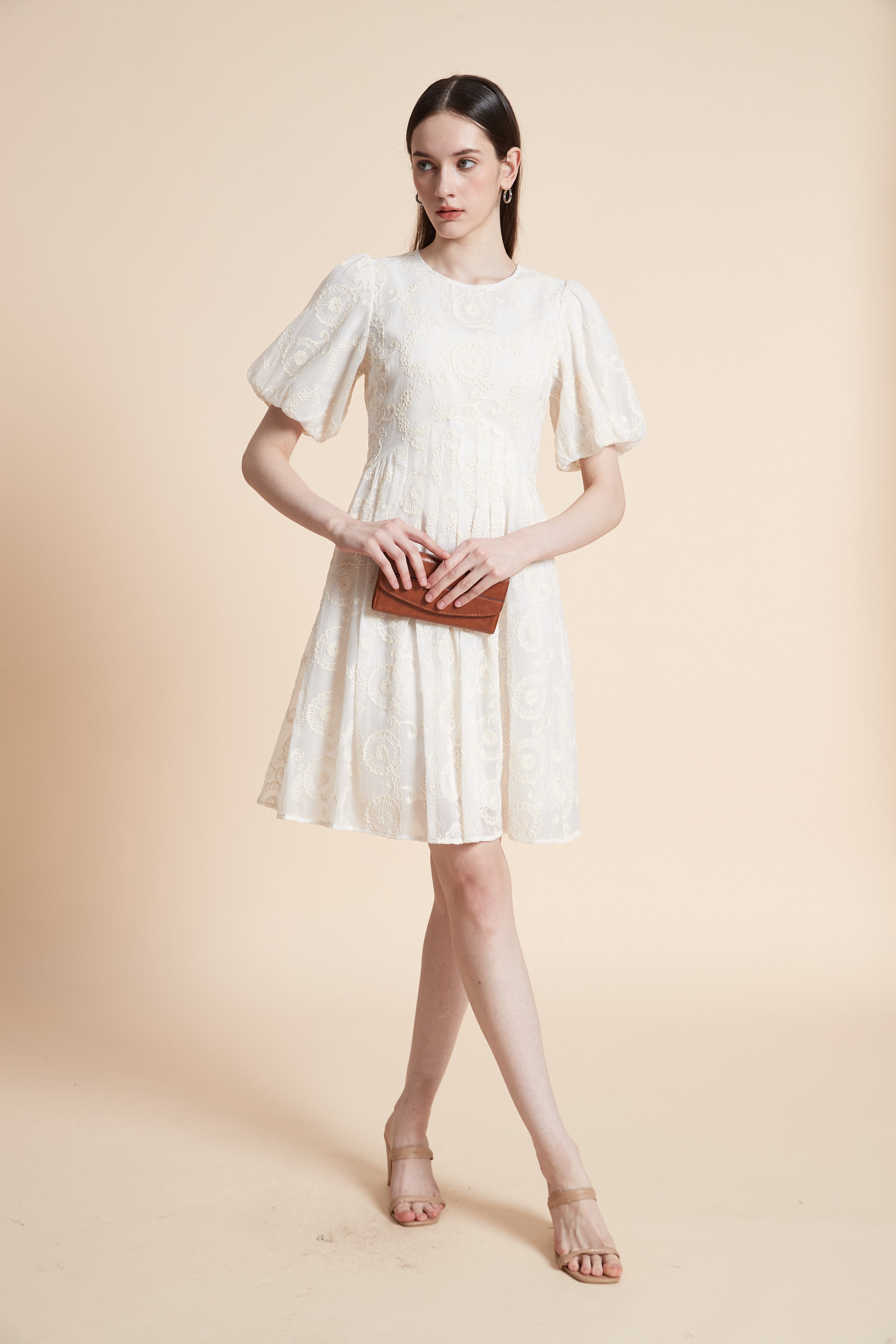 فستان ميدي مطرز بأكمام قصيرة